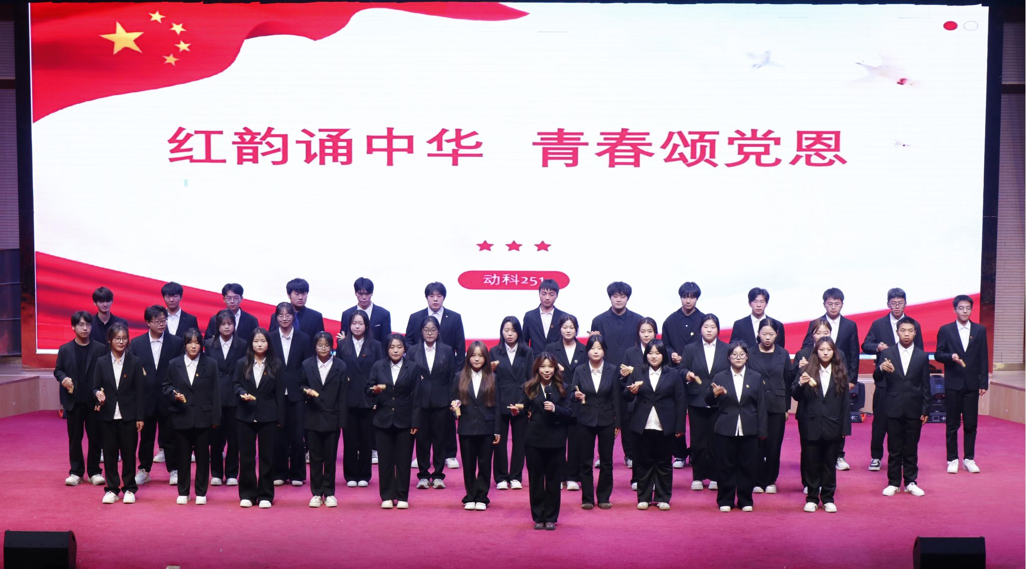 进入“青春告白”篇章,中医康复247班的诗朗诵伴舞《宝岛融情入九州》,抒发了对祖国统一的深切期盼;动医241班以朗诵与合唱相结合的形式演绎《颂祖国唱山河》,唱出了对祖国的炽热情怀;动科251班的《红韵诵中华青春颂党恩》,则通过多元形式展现了新时代青年对党和国家的赤诚之心。